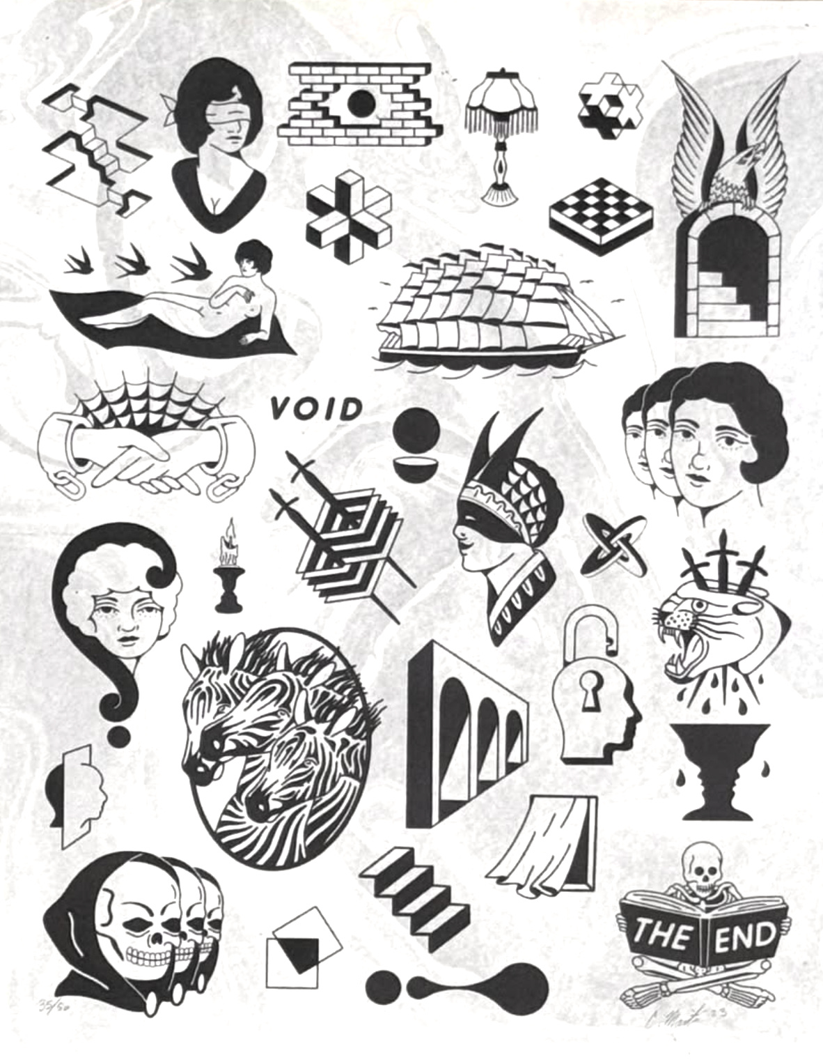 These risograph prints by Christopher Martin merge the art of handmade printmaking with his background as a tattoo artist—find these and numerous other prints, patches, and sculptural wall hangings on his website.