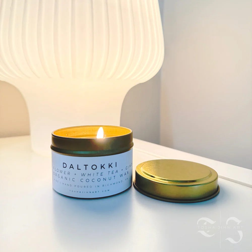 These small batch hand-poured candles are perfect for morning meditations, writing your morning pages, or as a thoughtful gift; lightly fragranced with rice flower, white tea and ginger oils.
